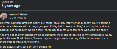 I knew that despite not being one of my references, because it was internal the new department would have to call my old boss. Mike literally told me, on this blessed day: “Unless they tell me you were snorting all the lab cocaine or axe murdering technicians, we’re fine.” And the old boss did try to sink me, saying I wasn’t creative or motivated, and had no future as a scientist. Mike’s response to the worried admin: “I’ve met her, and when you meet her, you’ll know it’s not true.” He was and is the literal best, and I’ve done everything I can to try to prove his faith in me true.