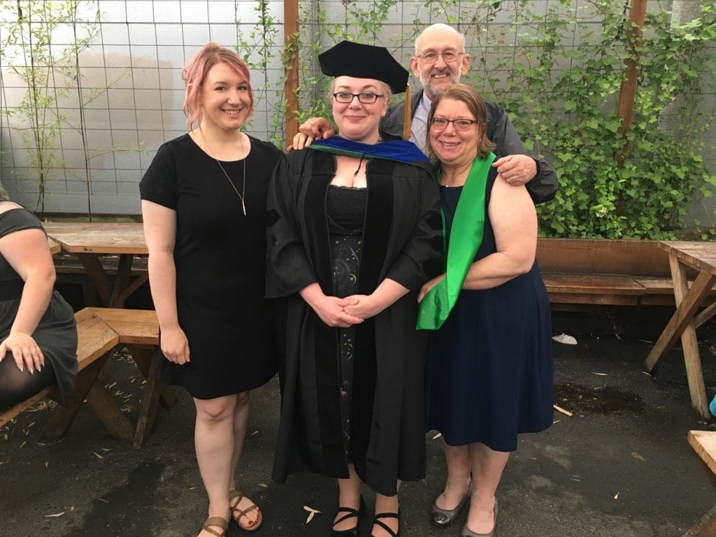 The green thing my mom’s wearing the photo is called a Gratitude Stole. It is a way for Portland State to make more money off you help you express gratitude to the people who encouraged your journey. You buy it and write something to the people you’re going to give it to, and then wear it in your ceremony to gift to them later as a thank you. I wore this one for my parents, who took some college classes when Erica and I were kids and didn’t get degrees but always told us both that we would go to college. And we did. (I wore another one at my departmental commencement to gift to my advisor, as his first and so far only graduate student, it hangs in his office.)