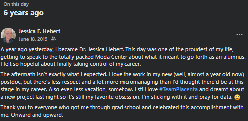 A few weeks after I graduated with cheers of “No more 60+ hour workweeks! Yay work life balance and getting paid what I’m worth!”, I started my job as a postdoctoral fellow in a placenta research lab. The first few months were wonderful. I was working with human samples. I loved learning the new techniques and brainstorming future ideas. I thought I was just getting my feet under me enough so that my new boss would give me some independence.